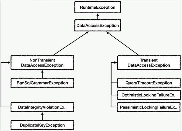 그래서 앞에서 만들었던 MyDBException 이니 MyDbDuplicateKeyException 이느니 이런거 안만들고 위에 추상화 계층을 확인하면서 내가 파싱해주고 싶은 Exception 들을 확인해주면 된다 ^~^. (최상위 계층인 DataAccessException 이 요긴하게 쓰인다)