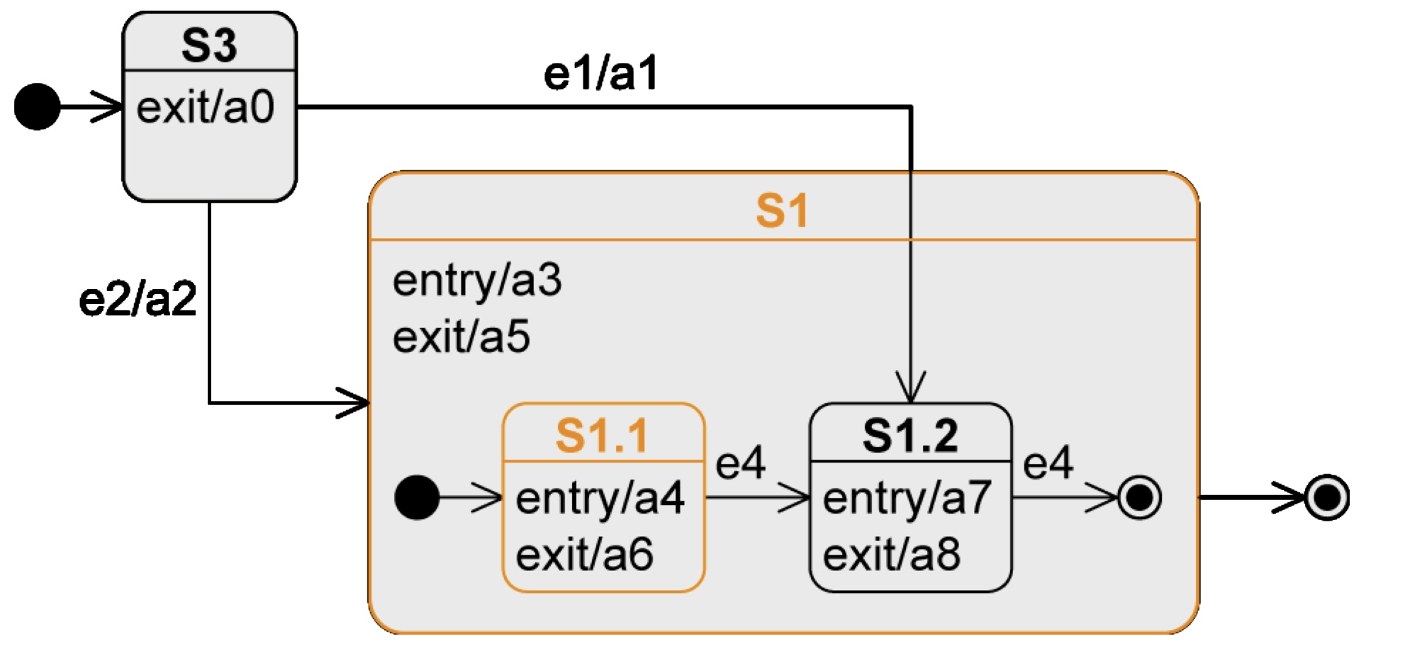 다른 Flow 로는 S1.2 로 e1 이 발생해서 직접 진입하게 되는 것이다. operation 은 순차적으로 a0, a1, a3, a7 이 수행되게 된다. S1 탈출시에도 탈출 event 에 따라 exit operation 을 수행하면서 나가게 하면 되는 것이다. 이 예제에서 파악한 것처럼 action 의 순서를 잘 파악하는 것이 중요하다.