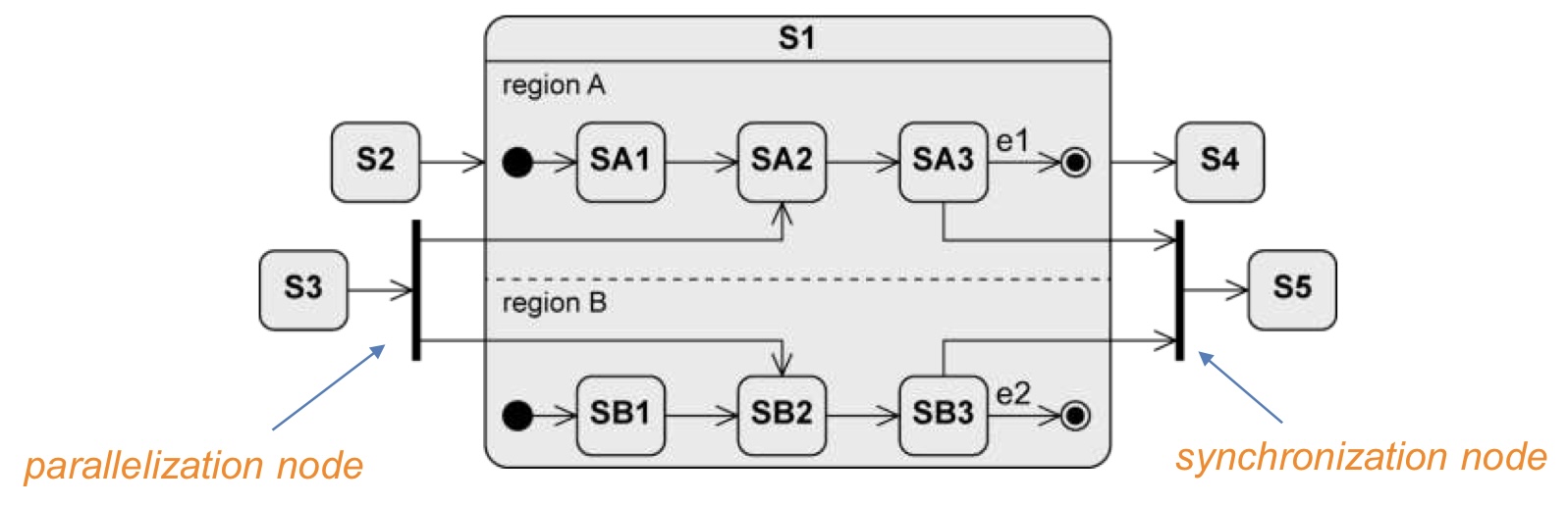 주목할만한 부분은 진입과 탈출 부분이다. 어떤 방식으로 진입하던 S1 에 들어오면 무조건 region A,B 모두 Active 하게 들어간다. parellelization node는 특정 경계를 통해 직접 들어오는 상황인데, 이 때는 가능한 region 으로 모두 들어감을 보장해줘야 한다. synchronization node 또한 sync 를 맞춰서 나감을 보장해주는 명세이다. SA3 에서 e1 이 아닌 다른 방식으로 탈출을 했다면, sync node 에서 모든 region 이 수신되는 상태를 기다렸다가, 함께 S5 로 탈출해야 한다.