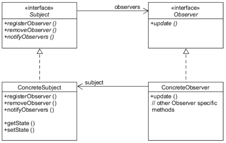 Subject Class 에서는 훨씬 간단하게 구현할 수 있고 Observer 측에 대한 그 어떤 의존성도 존재하지 않는다. Observer 들이 보관되어야 하는 자료구조도 관리해주기 위해 Observable 은 interface 가 아닌 abstract class 로 정의되었다. 그저 나는 Subject 객체이니 혹시나 나에게 등록된 애 있으면 알려라 정도로 구현된 수준으로, 별도 Observer 가 추가 / 삭제 / 변경되는 것도 모르게 할 수 있다.