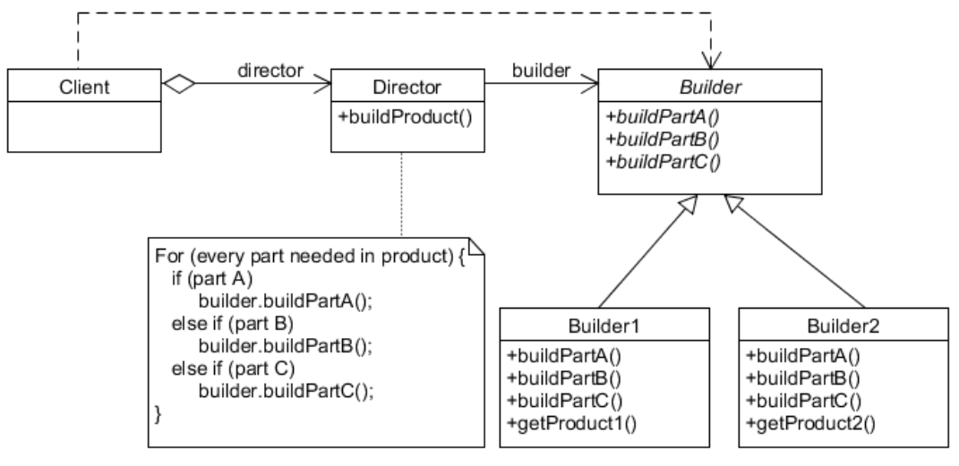 중요한건 Director 는 필요한 Part 들과 최종 Product 를 만들기 위한 단계는 알고 있으나, 각각의 Part Object 들을 만드는 방법은 모른다. 따라서 세부적인 Part 를 만드는 지식을 알고 있는 Builder Interface 를 사용하게 된다 (Concrete Builder 들을 교환하며 사용). Director 는 사용할 Builder 를 Composition 방식(Inheritance 제외 4가지)으로 의존하여 각 빌더들을 사용할 수 있다.