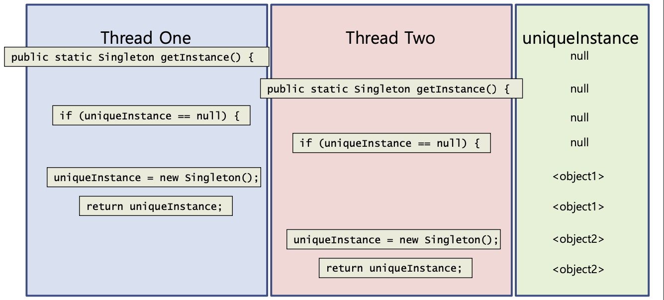 상단 그림과 같이 null 상태인 singleton instance 를 동시에 호출하여 호출하면서도 지속적인 Context-switch 가 발생한다면, 서로 다른 두 object 가 생성될 가능성이 충분히 있다 (이는 실패한 싱글톤이다).