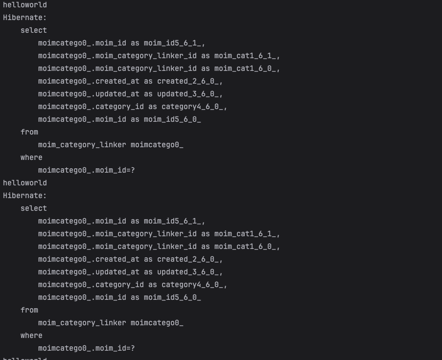 하지만 Controller 영역에서 Group.getGroupCategories() 를 하는 시점에 다음과 같이 쿼리가 발생하는 모습들을 확인할 수 있었다. 심지어 Group 의 갯수만큼 쿼리가 발생해서, N+1 문제를 확인할 수 있었다.