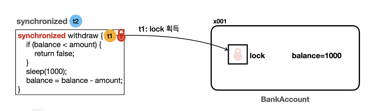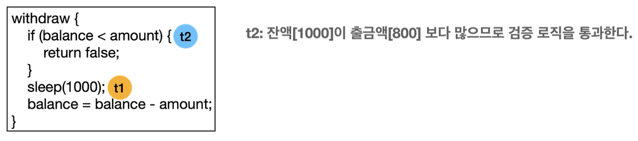 멀티스레드를 사용할 때 주의할 점은, 같은 자원에 여러 스레드가 동시에 접근할 때 (공유자원) 발생하는 동시성 문제이다. 인스턴스의 필드, 자료구조 등 모두 공유 자원에 속할 수 있다. 은행과 계좌에 대한 상황은 동시성 문제를 설명하기에 매우 적합한 예시이다. 다음과 같이 출금을 연속으로 시도하는 예제를 살펴보자.