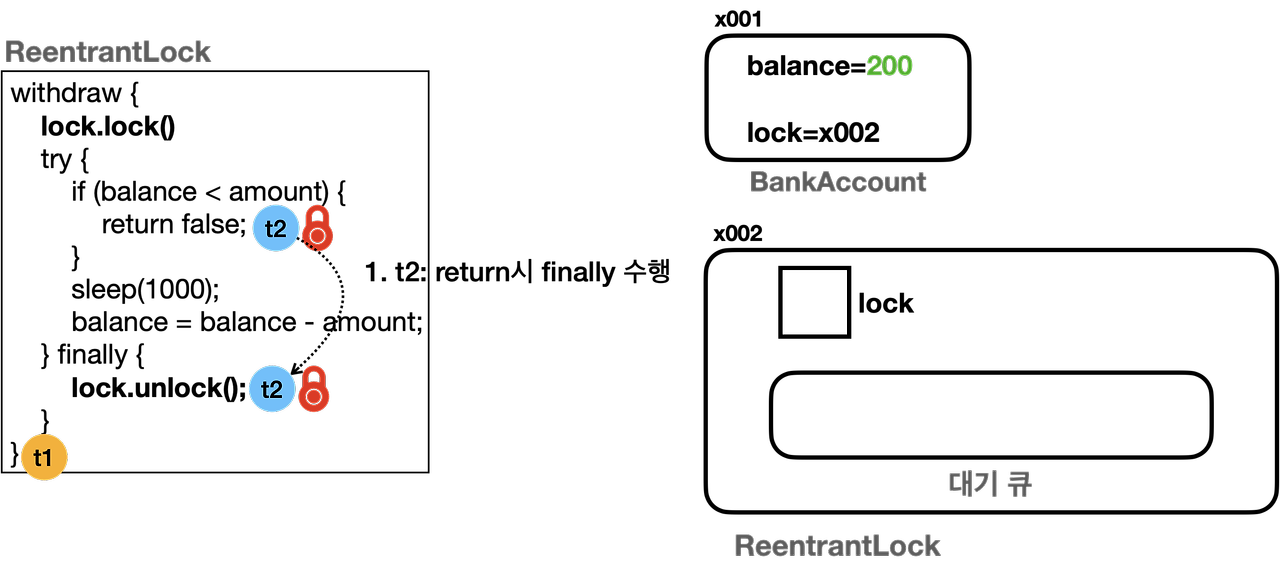 BankAccount 예제에 lock 을 간단하게 활용하는 모습을 볼 수 있다. 제일 중요한 것은 마지막에 lock.unlock() 을 꼭 해주기 위해 try/finally 문을 사용한다는 점이다. t1, t2 중 락을 얻지 못한 스레드는 lock() 함수 호출 시 내부적으로 LockSupport.park() 이 호출되어, WAITING 상태로 변하고, ReentrantLock 내부 대기 Queue 에서 관리된다. tryLock 함수였을 경우 당연히 TIMED_WAITING 상태로 변하고 Queue 에서 관리된다.