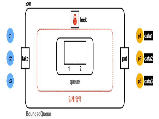 지금까지 생산자/소비자 문제, 즉 "한정된 버퍼 문제"를 해결하기 위한 BoundedQueue 클래스를 살펴보았다. 하지만 이는 스레드 입장에서 "차단"을 하기 때문에, BlockingQueue 라는 말이 존재한다. put 함수는 공간이 가득차면 추가 작업을 차단 시키고, take 함수는 비어있으면 획득 작업을 차단시킨다. 이는 실제 동일한 pckg 에서 제공하는 BlockingQueue 의 내용이다. 다 제공해주는 내용이지만, 생산자/소비자 문제를 잘 이해하면 Java 멀티스레딩의 기본기를 잘 익혔다 할 수 있기 때문에 지금까지 공부한 것.
