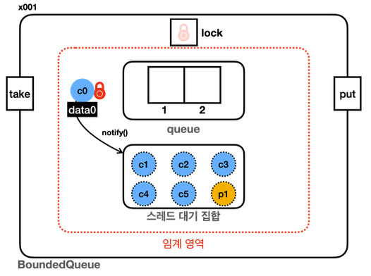 락 대기 집합이 1차 대기소이고, 스레드 대기 집합이 2차 대기소인 느낌이다. 스레드 대기 집합을 탈출해도 BLOCKED 가 되어 1차 대기소에서 락 획득을 기다려야 하기 때문이다 (이제 다 이해 되어야 함). 즉, 모~든 자바 객체는 없어도 있을 수 있는 "임계 영역" 관리를 돕기 위해 내부적으로 3가지 기본 요소를 가져가는데, 모니터 락 (Intrinsic Lock), 락 대기 집합 (Blocked 스레드들), 그리고 스레드 대기집합(Waiting 스레드들)이다. 이 세가지 요소가 어떻게 순환되는지 설명할 수 있어야 한다.