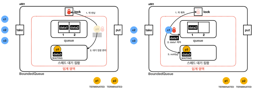 위 그림을 보면 알겠지만, 사실 BLOCKED 상태의 스레드들도 자바 내부에서 따로 자료 구조로 관리된다 (단, 정확한 이름이 없다 - 락 대기 집합정도). E-Lock 을 설명하면서 처음으로 wait set 의 모습을 보여줬고, 이제 BLOCKED 집합소도 설명하는 것 (wait, notify 를 처음 이해하기도 어렵기 때문). 위 그림상 소비할 데이터가 없기 때문에 wait() 함수가 있다면, C1 은 "I-Lock을 반납"한 다음에 WAITING 으로 진입한다. 이후 락이 반납되었기 때문에 C2,C3 스레드들도 순차적으로 임계 영역에 진입하고, 결과적으로 모두 WAITING 상태로 wait set 에서 대기한다. 지금까지 총 3가지의 대기 집합 자료구조가 나왔음을 이해하면 넘어가도 된다.