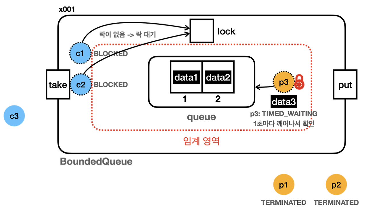 이어서 [소비자3] 스레드도 아무것도 획득하지 못하고 NULL 을 반환받게 된다. 이 때 역시 [소비자3]은 데이터가 큐에 추가될 때까지 대기하고 싶을 수도 있다. "큐에 데이터가 채워진 것을 어떻게 알 수 있는가?" 이 부분 역시 동일한 문제이다. 두 상황은 다르지만 같은 문제를 야기하고 있다는 점이 한정된 버퍼 문제의 핵심이다.