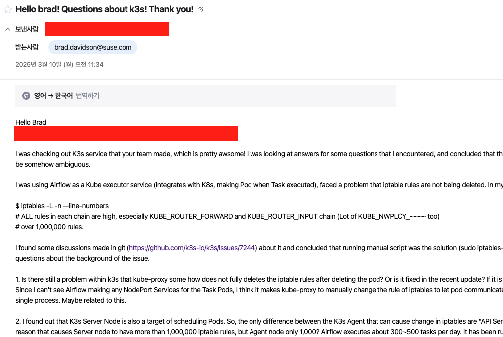 알아본 결과 Airflow 에서 Pod 를 띄우고 외부와의 Connection 설정을 해줄 때는, 별도의 NodePort Service 나 Endpoint 를 생성하여 kube-proxy 에게 iptable 제어를 트리거시키지 않는다고 한다. 내가 헷갈렸는데, Pod 가 "외부로 보내는 통신" 과 "외부에서 보내는 통신"은 당연히 다르게 제어된다 (아니 이거 헷갈려서 종일 고민했다..). 즉, iptable 을 직접 수정하지 않아도, 기본적으로 Pod 가 외부로 보내는 트래픽은 SNAT 룰을 자동으로 적용해서 허용된다고 한다 (정확히는 잘 모르겠다). 내 Task 들이 외부와 통신이 가능했던 이유는 이 덕분이였다. 그리고, 외부와의 통신을 위한 규칙은 별도로 제어하지 않는 것으로 결론을 내릴 수 있었다.