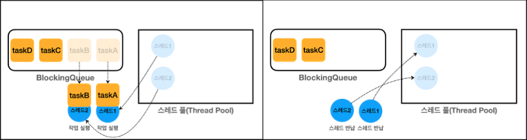 위 상황은 기본적인 ExecutorService 에게 생산자 / 소비자 역할을 할 Queue 를 던져주고, 작업을 수행할 스레드 공간을 정의해주면서 생성하였다. 기본적으로 "없을 경우 Thread 생성하고, max 를 넘어가는 선에서는 재사용" 이 원칙이므로, 두번째 작업에서부터는 바로 스레드가 실행되지 않고 대기된다 (Task C,D 가 A,B 완료 이후에 시작). 작업이 완료되면 "pool = 2"의 출력을 유지하는 것으로 보아, Thread 를 종료시키지 않고 재사용하기 위해 Pool에 다시 넣어두고 대기시켜 놓고 있다. 그리고 ES를 shutdown 시키면 비로소 스레드를 파괴시켜 자원을 반납하게 된다.