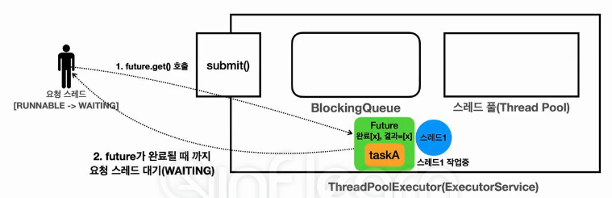 ExecutionException → 작업 중 예외가 발생한 경우 (뒤에서 자세히 나온다) - timout parameter 를 전달하면 예외를 발생시킨다 (요청 스레드가 대기할 최대 시간 지정)