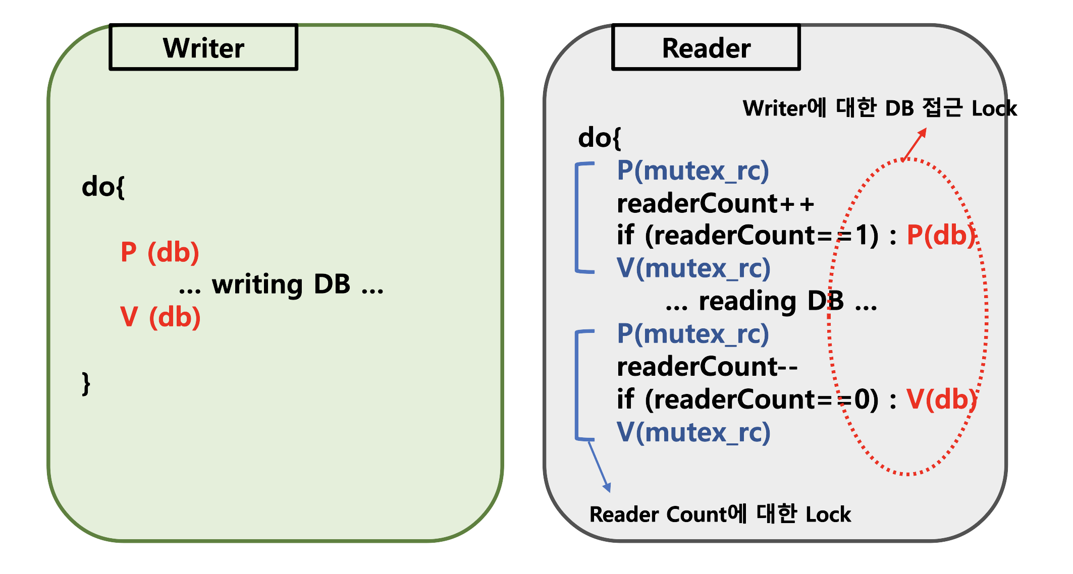 단, Reader 같은 경우는 여러 친구들이 같이 해도 된다는 점에서 차이가 있다. 우선 DB Lock을 걸지 않으면 Writer가 갑자기 들어와서 써버릴 수도 있기 때문에, P(db), V(db)는 필요하다. 다만 읽기 위해 제어한 Lock Mutex라면, 다른 Reader 들도 읽을 수 있도록 해볼 것이다. 모든 Reader만이 접근 가능한 Reader Count 변수를 설정할 것이다. 그리고 접근시 Reader Count++ 를 진행하면서 들어오되, Reader Count 가 1일 경우 현재 유일한 Reader 이기 때문에 Writer 를 막아줄 수 있도록 P(db)를 사용하여 Lock을 건다. 후속으로 들어오는 Reader 들은 Reader Count 값이 1일 경우 바로 그냥 DB를 읽기만 해주면 된다. (P(db), V(db)는 Writer 들만 제어하는 Lock이라고 하자)