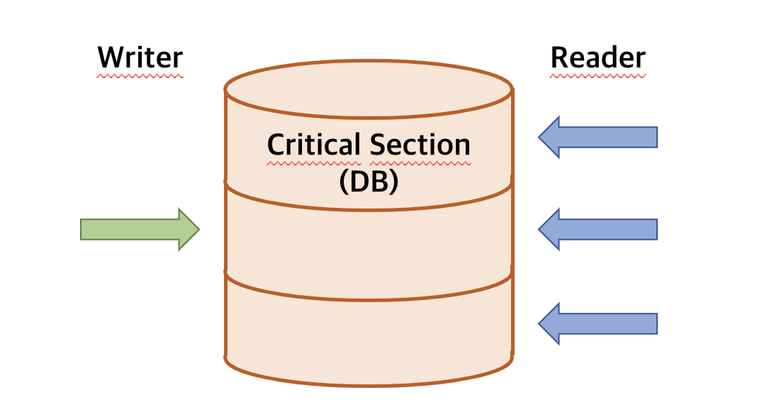 Reader and Writer 문제는 저장되는 Database 를 공유 데이터로 보고, 같은 DB에 동시에 write, read 하려는 문제를 말한다. 우선 위와 같이 문제에 대해서 접근해보면, DB는 공유데이터이므로 여러 프로세스가 접근하면 안될 것 같다. 하지만, write 는 반드시 제어가 필요하지만, read는 여럿이 동시에 해도 된다는 점이 다르다. 그렇다면 이를 Reader and Writer 각각 어떻게 세마포어로 제어를 할 수 있을까? (이 문제부터는 그림으로 하겠다...)