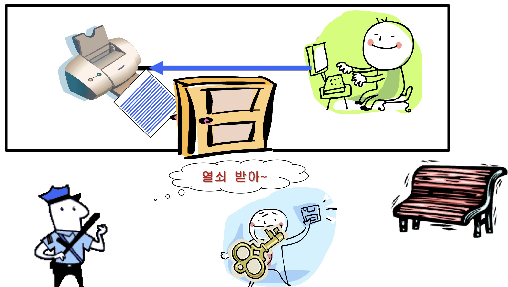 인쇄기가 한 대밖에 없는 사무실이 있다고 해보자. 이 인쇄기는 특이한 인쇄기라서 만약에 인쇄가 여러 요청이 들어온다면, 그냥 들어온 요청을 한꺼번에 출력하는 인쇄기이다. 이 인쇄기를 그냥 아무 제약 없이 쓸 수 있게 해놓는다면, 인쇄한 결과물이 그 어떤 사용자도 원하는 결과물이 아닐 것이다. 따라서 우리는 인쇄방을 만들 것이고, 인쇄방을 들어가기 위한 열쇠를 만들 것이다. 인쇄방에는 한 명만 열쇠를 할당받아 들어갈 수 있고, 사용하는 동안 잠궈놓을 것이며, 다 완료가 된다면 열쇠를 관리인에게 반납을 할 것이다. 관리인은 기다리고 있는 사람에게 열쇠를 할당하게 된다.