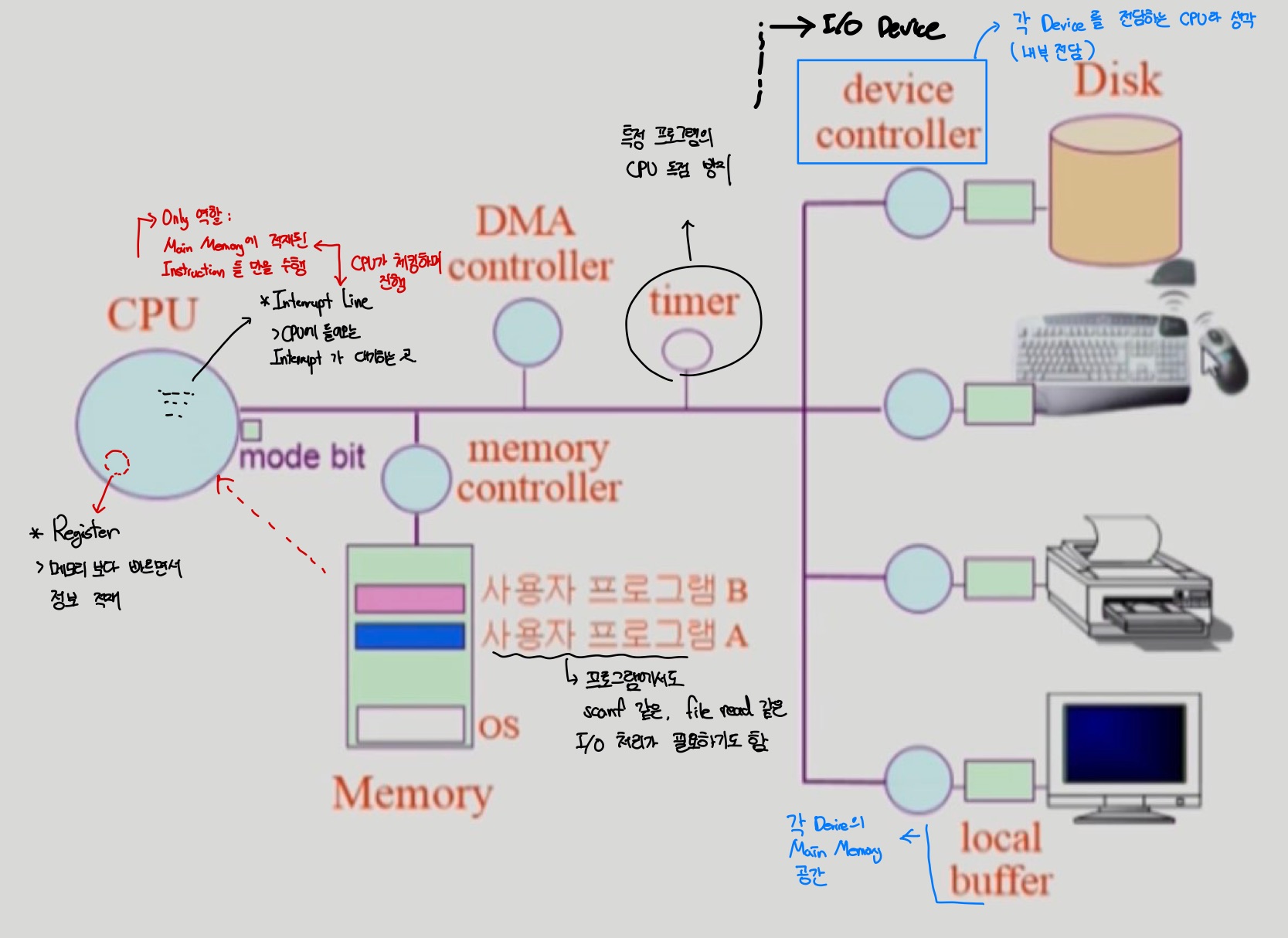 - 각 I/O Device 들 까지 CPU가 왔다 갔다 하면서 관리할 수는 없기 때문에, 각 Device 마다 내부를 담당하는 미니 CPU, Memory들이 각각 있는데 이를 Device Controller / Local Buffer 라고 한다